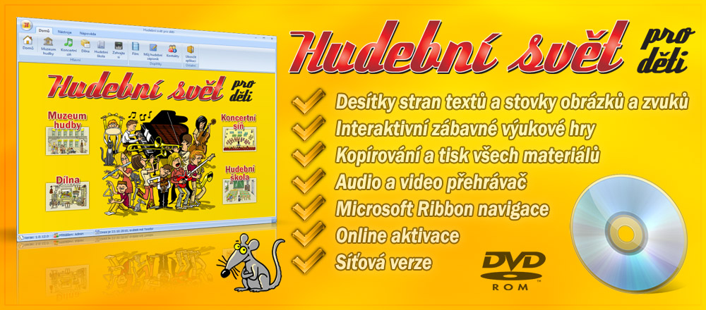 Jedinečná multimediální pomůcka spojuje klasický hudební obsah s moderní formou počítačové hry. Zahrnuje výukové, testovací i zábavné prvky. Vhodná pro žáky ZUŠ i samouky. V prostředí Muzea hudby, Koncertní síně, Dílny a Hudební školy formou hry seznamuje se systematikou hudebních nástrojů, hudebním názvoslovím či dějinami hudby. Obsahuje životopisy skladatelů s ukázkami jejich tvorby, přibližuje výrobu vybraných hudebních nástrojů a představuje historické instrumenty. Malým hudebním experimentátorům flétnu, kytaru, návod k naladění kytary včetně elektronické ladičky, přehled kytarových akordů či jednoduché notové záznamy s možností kontrolního zvukového přehrávání. Součástí výukových celků jsou fotografie, názorné obrázky, schémata a zvukové ukázky.