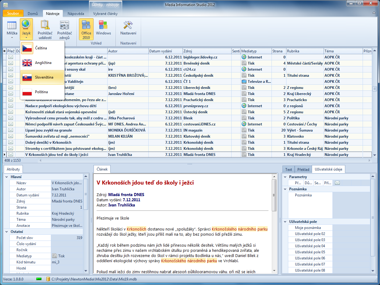 Ke každému článku je možné přidat řadu uživatelských údajů (sentiment, příznak, důležitost, uživatelská pole, komentář, překlad apod.). Článek má také svůj formátovaný náhled, který je možné zcela libovolně konfigurovat pomocí XSLT šablon. Stejně tak je možné nastavit vzhled a obsah HTML exportů, tedy například přidat i číslovaný obsah. Export Manager dále umožňuje výstup dat do všech výše uvedených datových formátů, ale také do RTF formátu, který je generován bez použití jakékoliv další aplikace (MS Word), a tedy velice rychle.