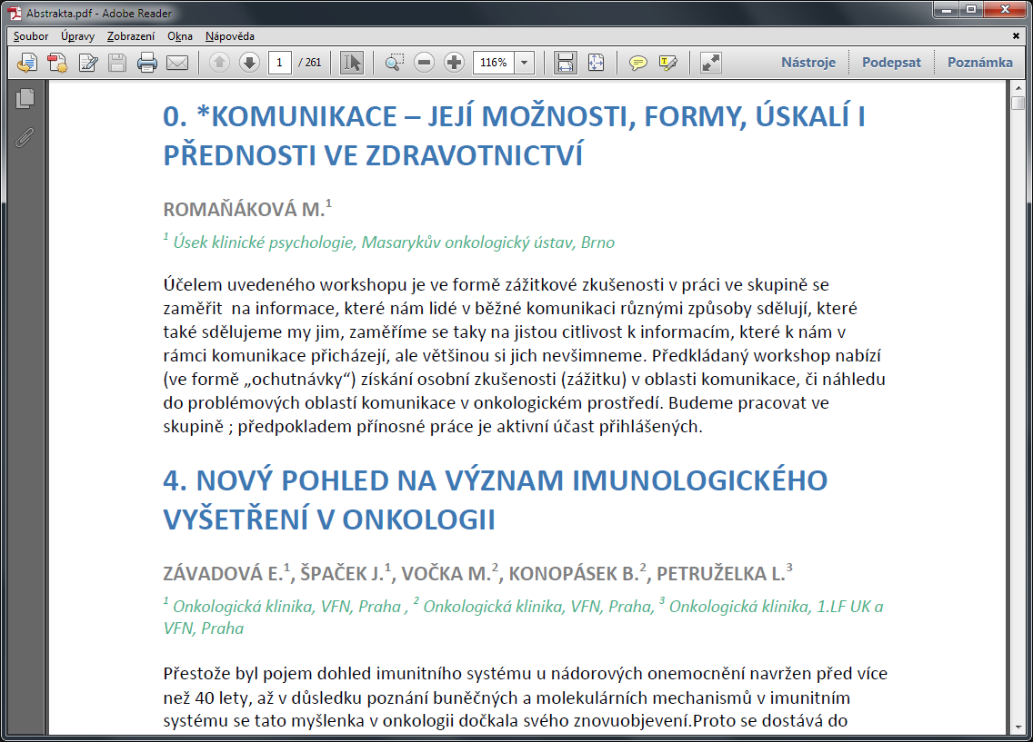 Pro společnost TEVA jsem připravoval prezentační USB disk, který bude rozdáván cca 1600 účastníkům konference Brněnské onkologické dny 2014. Aplikace byla připravena v Delphi v kombinaci s profesionálními komponentami na zobrazení dat, hledání, řazení, filtrování atd. Data byla zpracována pomocí sady maker z velkého dokumentu MS Wordu a naimportována do MS Accessu. Na hlavní obrazovce byla použita speciální komponenta TileControl, která simuluje rozhraní Windows 8 a umožňuje velice atraktivní a dynamické zobrazování dat. Vedlejším produktem bylo PDF se všemi abstrakty a také jednoduchá HTML verze se všemi daty pro uživatele jiných platforem. V neposlední řadě byla připravena speciální pomocná aplikace na inteligentní hromadné kopírování dat na USB disky.