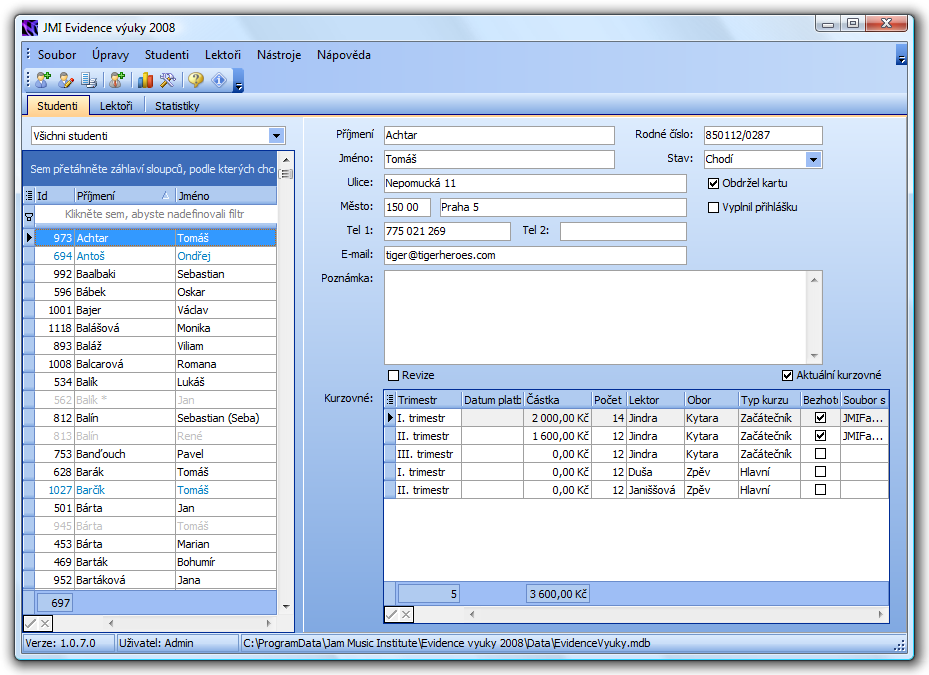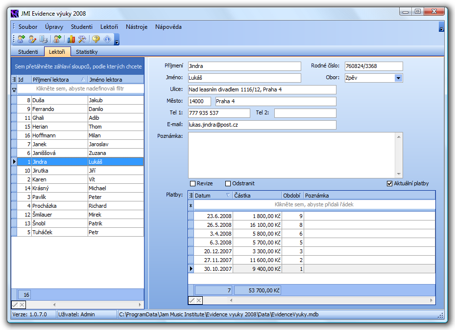 Databázový systém na vedení výuky spočívá v evidenci informací o studentech, lektorech, kurzech, umí sestavit podrobné statistkiky o obsazenosti kurzů, vytíženosti lektorů, tiskne faktury a celkově obsahuje řadu užitečných funkcí na přehledné vedení výuky této hudební školy. Systém je opět postaven na jádru MS Jet.