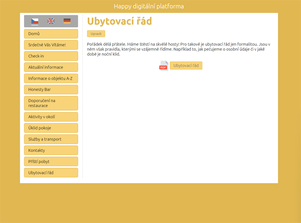 Webový projekt "Happy Rezervace", který slouží k poptávce ubytování, byl letos velmi zásadně rozšířen o speciální část "Happy Platformu". Je to malý informační systém sloužící návštěvníkům k získání řady důležitých informací o penzionu, pravidlech ubytování, ale také doporučení k výletům nebo objednání úklidu pokoje. Velmi specifickým modulem je průvodce přihlášením k pobytu, což vyžaduje zpracování řady údajů, ale také jejich následné vykazování na úřadech ve formě PDF exportu. S tím vším tento systém pomáhá a navíc je kromě češtiny také v angličtině a němčině. Původní projekt byl tak rozšířen o cca 30 *.cshtml stránek a řadu doprovodných tříd, objektů a překladových *.resx dat. A samozřejmě i celý Redakční systém byl upraven tak, aby umožňoval pohodlnou správu všech stránek ve všech jazykových mutacích.